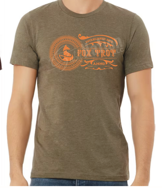 Short Sleeve T-Shirt, Vintage Fox Trot Ammo logo in orange