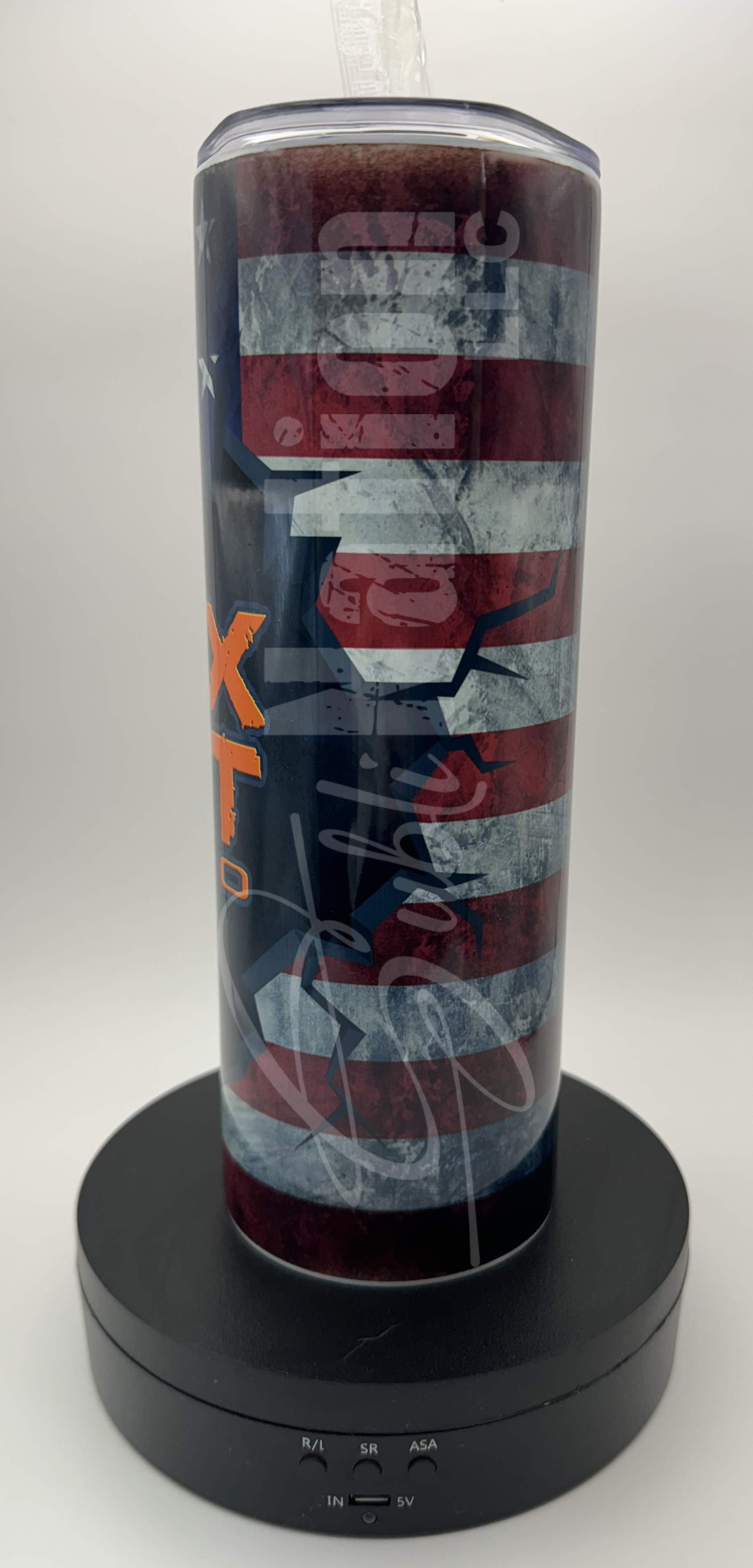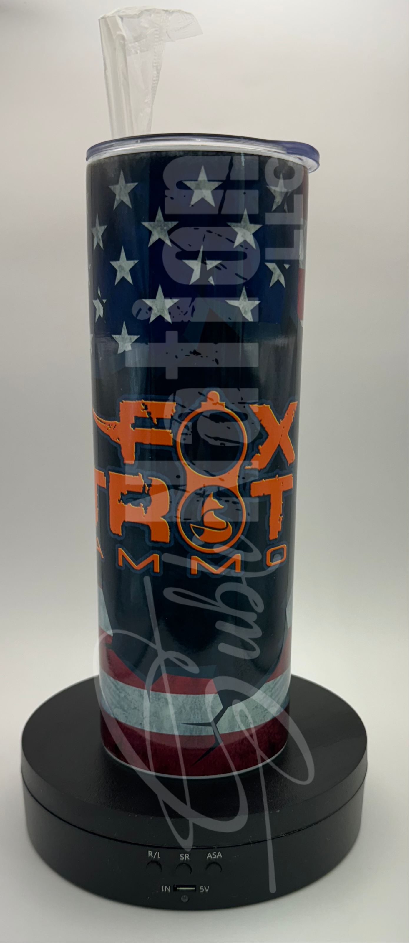 Sublimation tumbler with American flag & Fox Trot Ammo design.